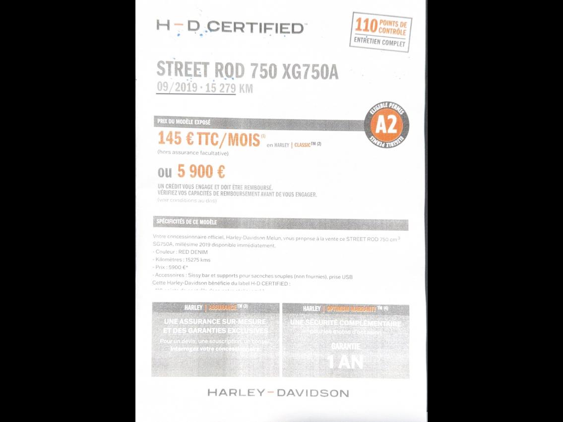 Votre concessionnaire officiel, Harley-Davidson Melun, vous propose à la vente ce STREET ROD 750 cm3 SG750A, millésime 2019 disponible immédiatement.