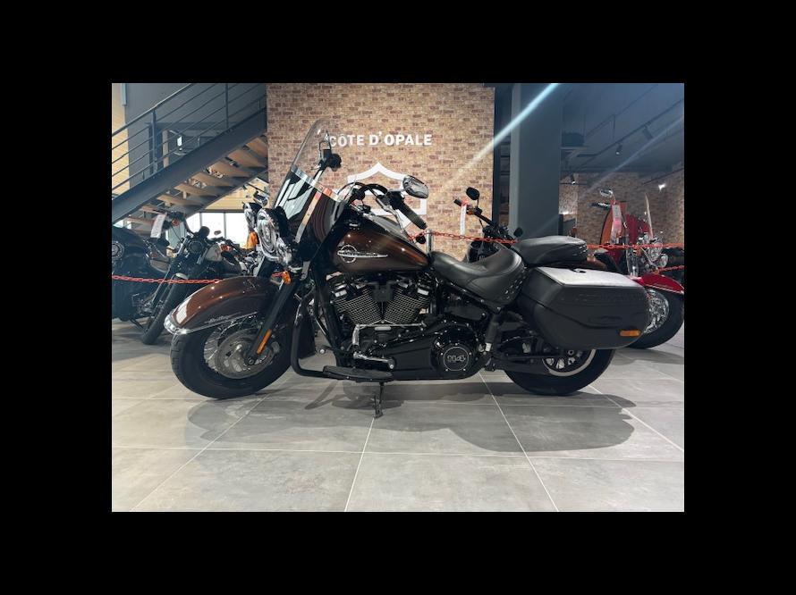 SOFTAIL HERITAGE 114, soit 1868cc de 2019 avec en équipement des silencieux homologués JEKILL (+ silencieux d'origine), selle confort pilote et passager, double sélecteur, pare jambe, kit 4 points pour sissy bar (non fourni), poignées chauffantes, couleur rawhide