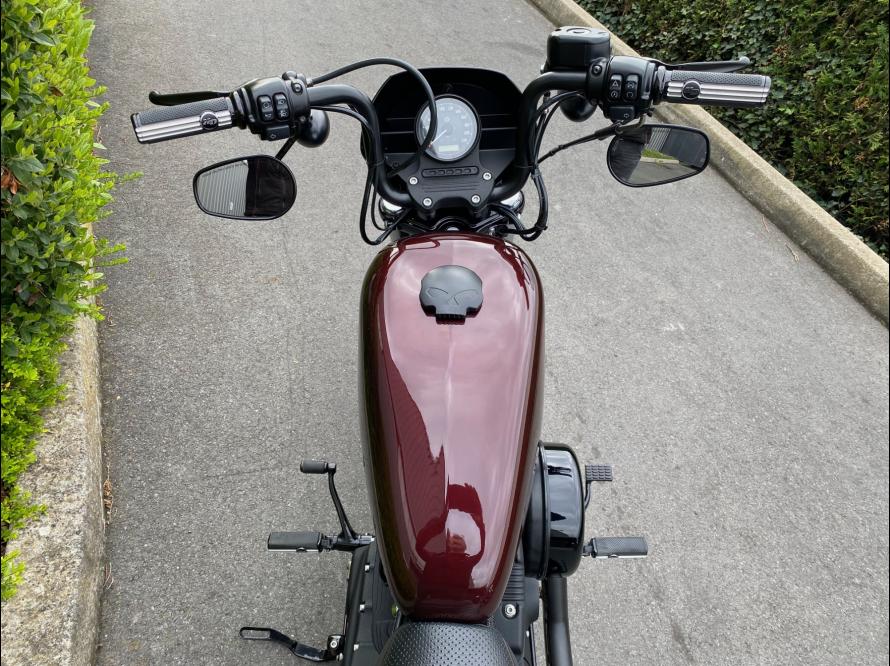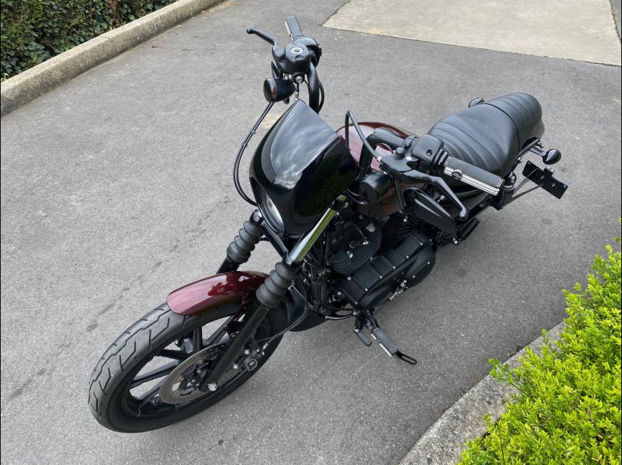 ACCESSOIRES : commandes avancées, ligne d'échappement Vance and Hines Grenade, selle duo, support de plaque latéral, guidon mini Apehanger, petites platines arrière, poignées et repose-pieds de la collection DEFIANCE, cabochons de clignotants avant et arrière ambrés, etc ...