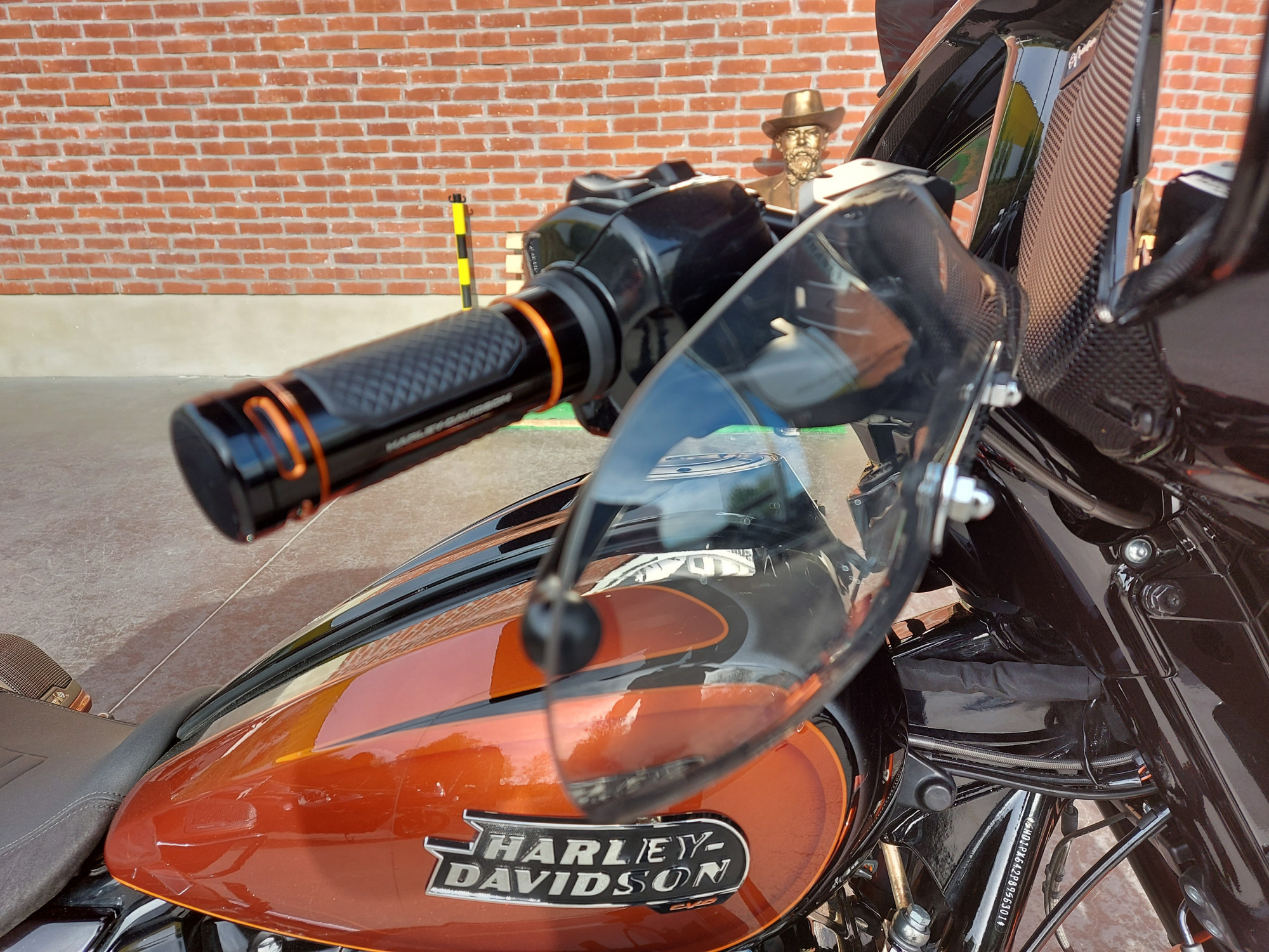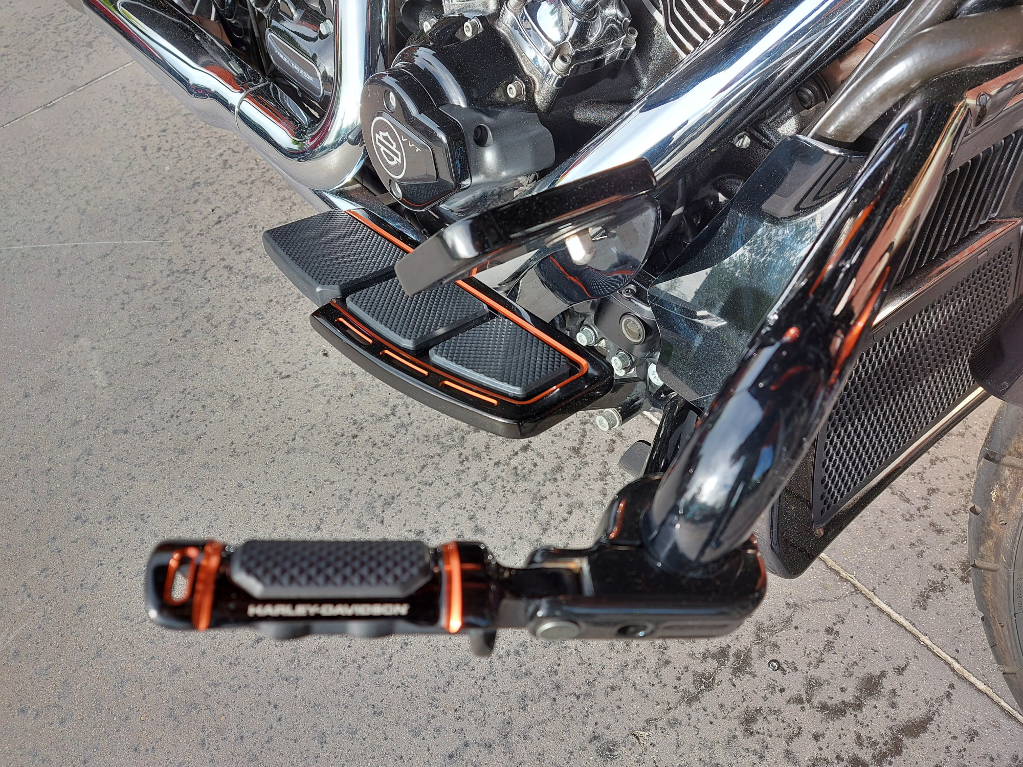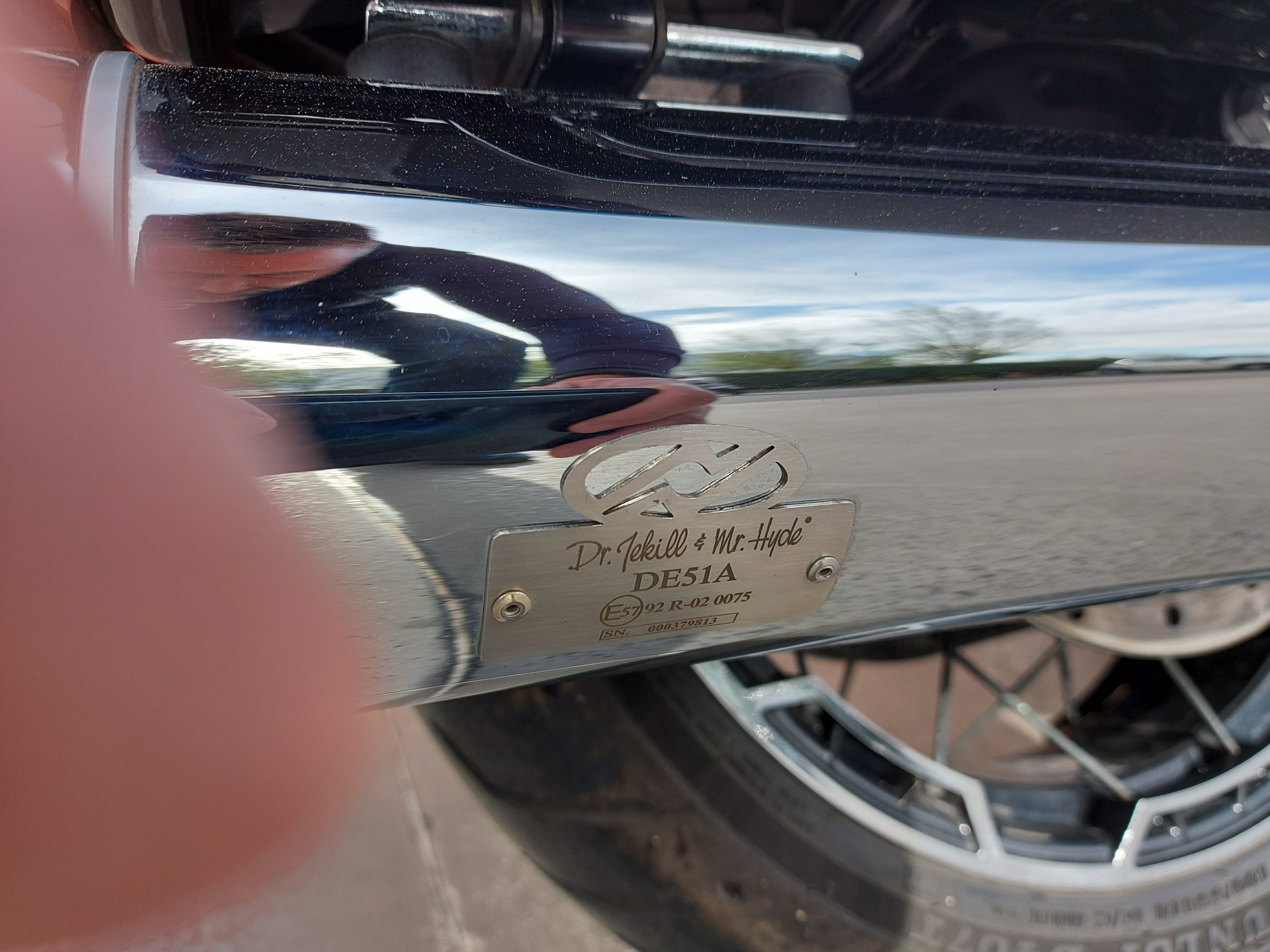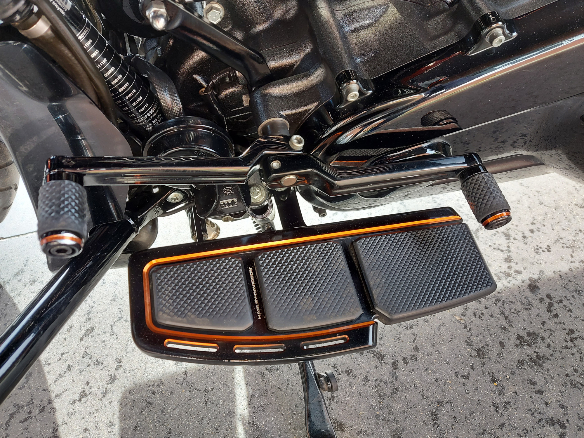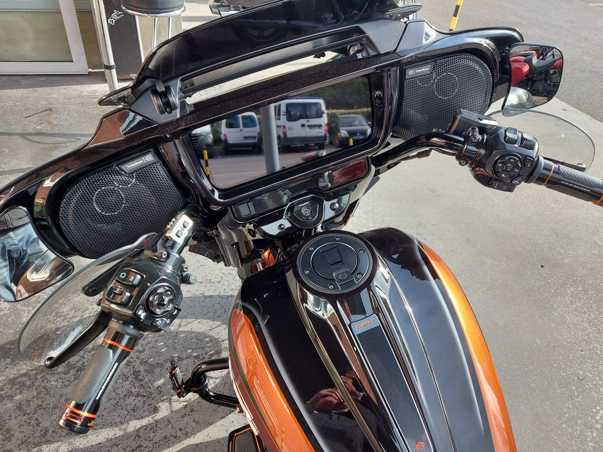 Cette moto est équipée des échappements Jekill à valves, d'une selle perso surpiquée orange avec pouf et selle passager assortis (pas sur les photos)