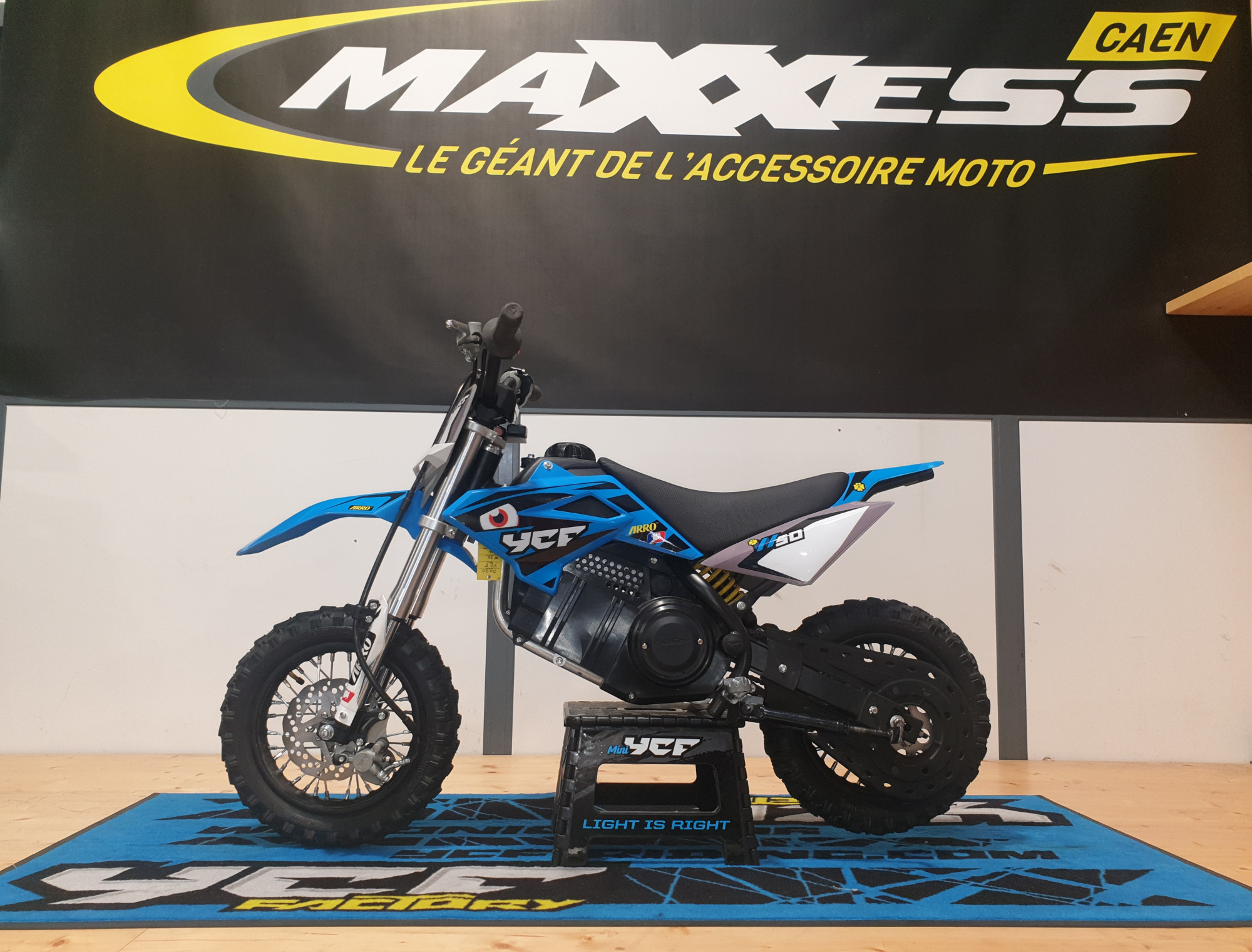 Moto de cross électrique équipé d'un moteur de 48V et d'une puissance de 1200 Watts alimenté par une batterie LI-ION de 10Ah.